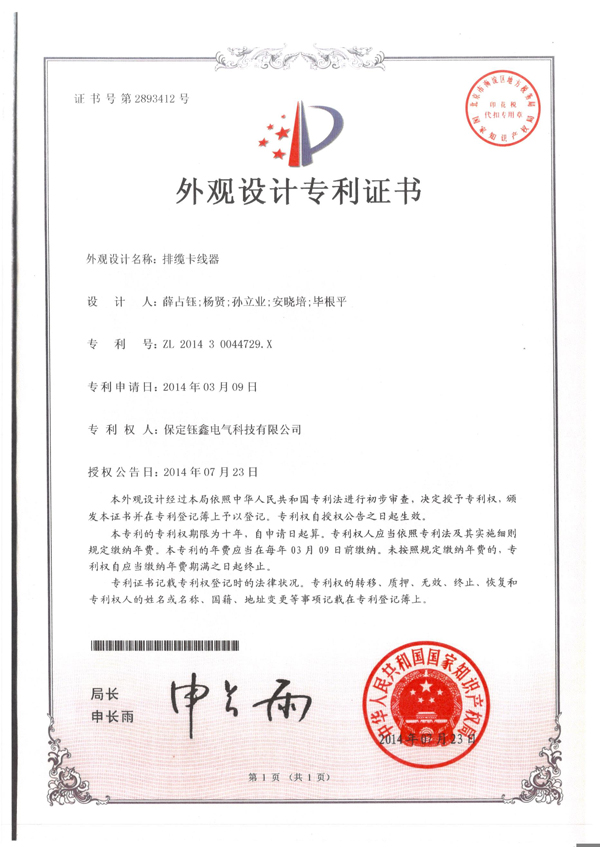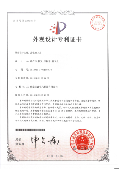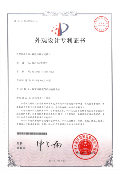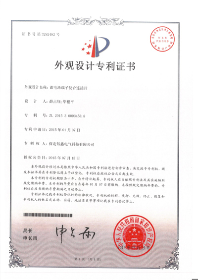 蓄電池端子連接片套件外觀設(shè)計(jì)專利證書(shū) 頭條